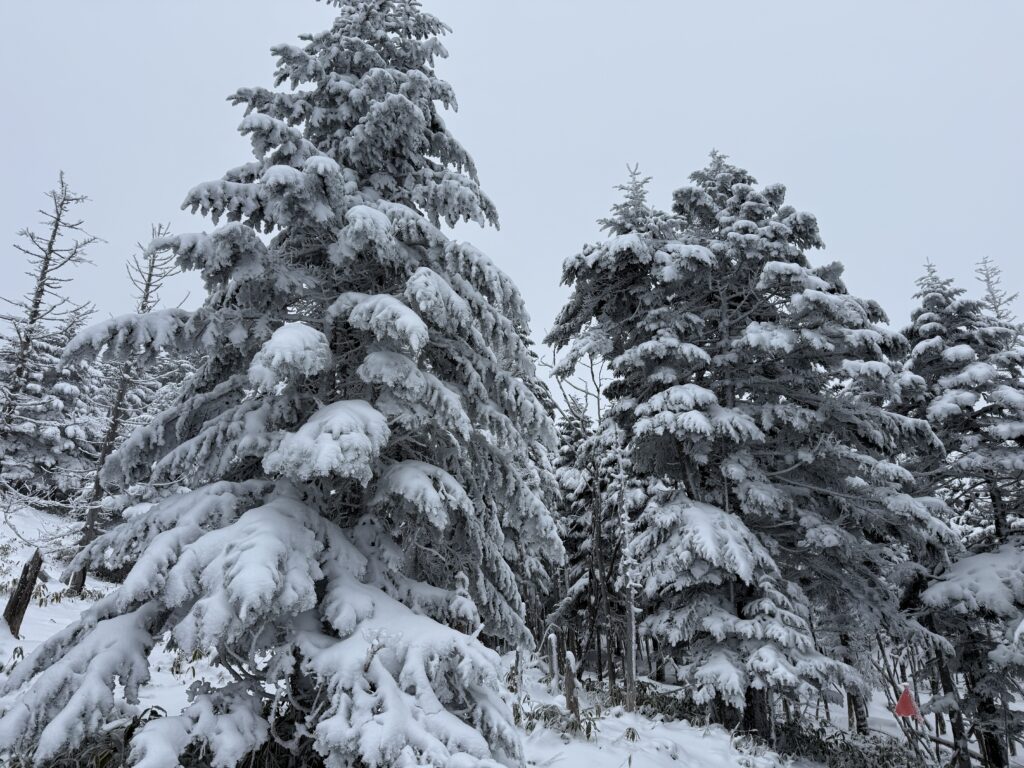 北横岳山頂の手前の樹林帯を抜けるタイミングで強風対策を整えました。